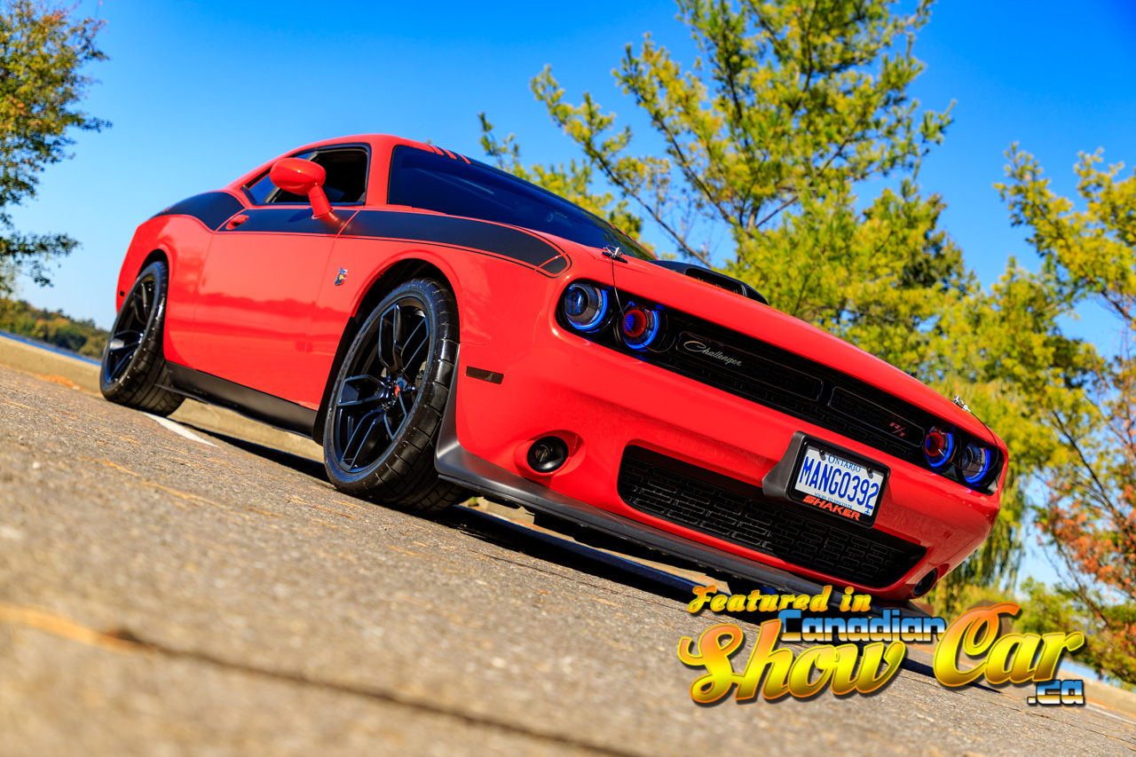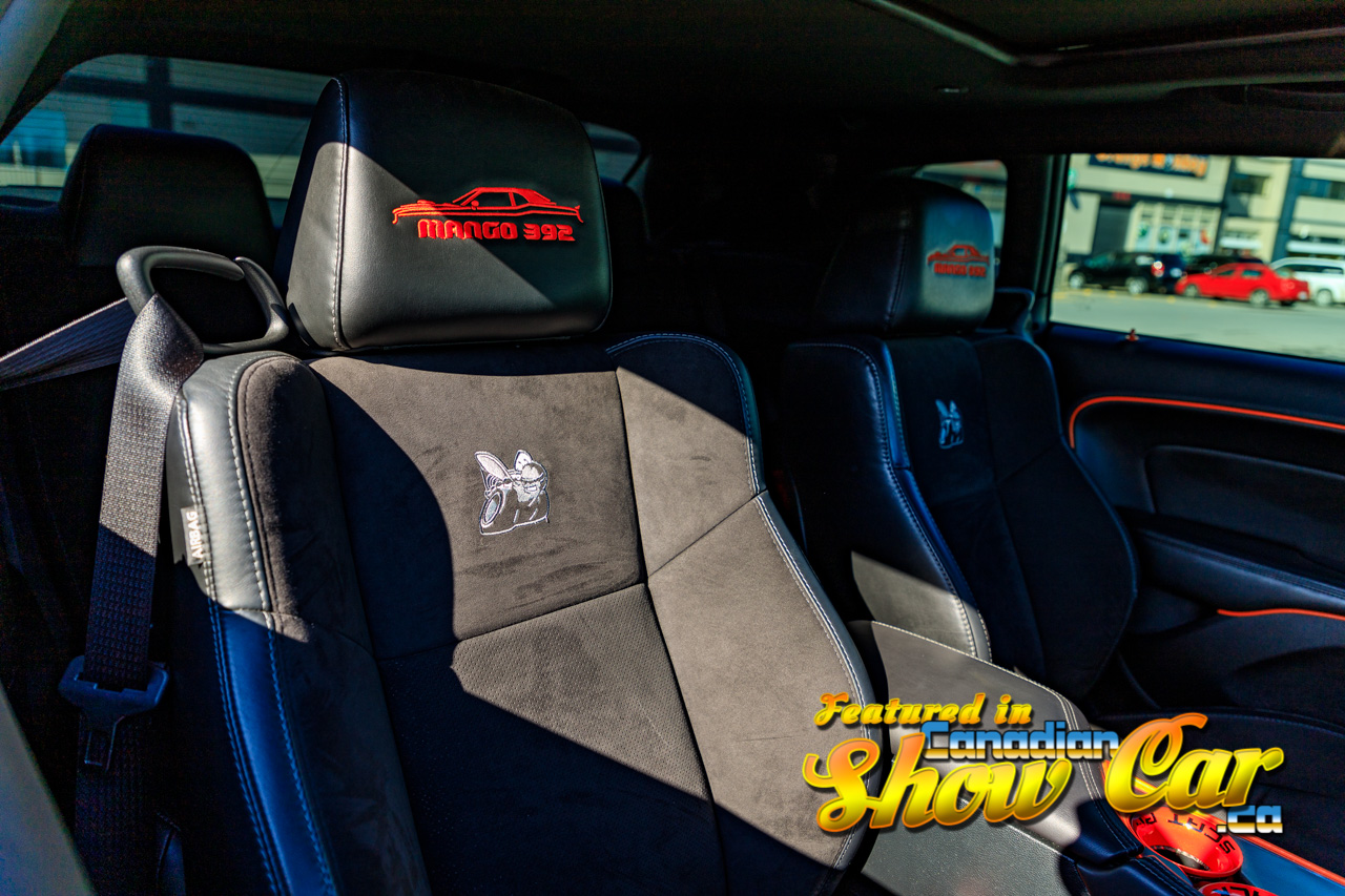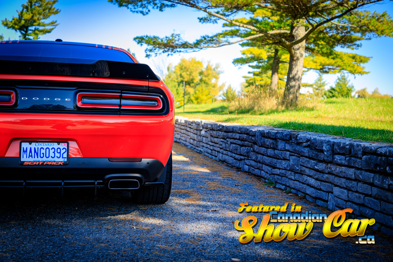 By the Summer of 2019, the outside appearance of his Challenger R/T changed drastically - with the addition of side graphics, a front splitter, a rear diffuser, custom license plates "MANGO392", a wickerbill, a new set of blacked out dual 5 spoke wheels and wider tires, new colour changing Halo headlights and demon eyes. "I'm learning very quickly that going to Car Shows and Cruise nights makes it very addictive to keep adding on to my car," says Chris, reflecting on his passion for his 2017 Go Mango Orange, 392 Hemi Challenger R/T.