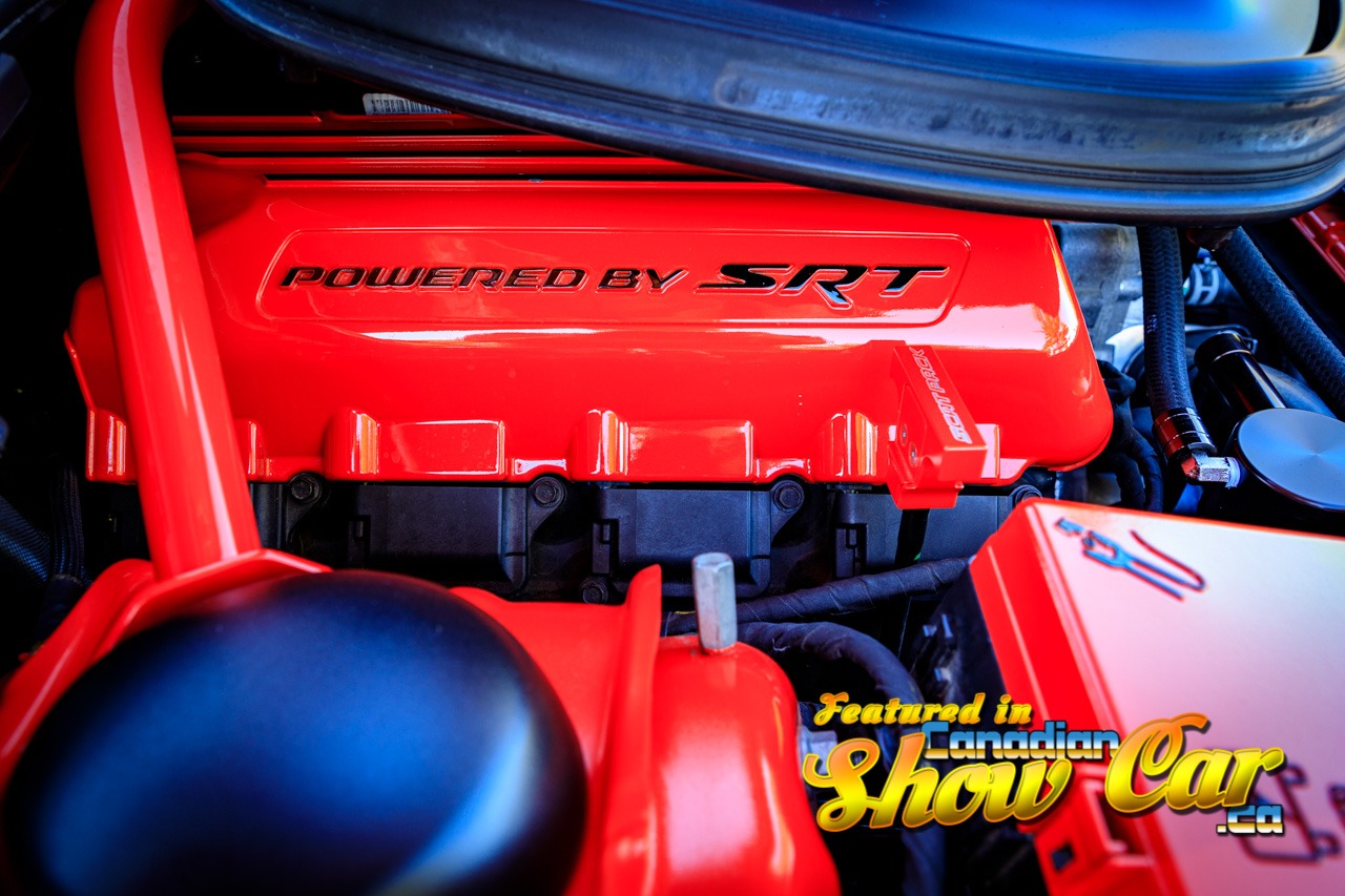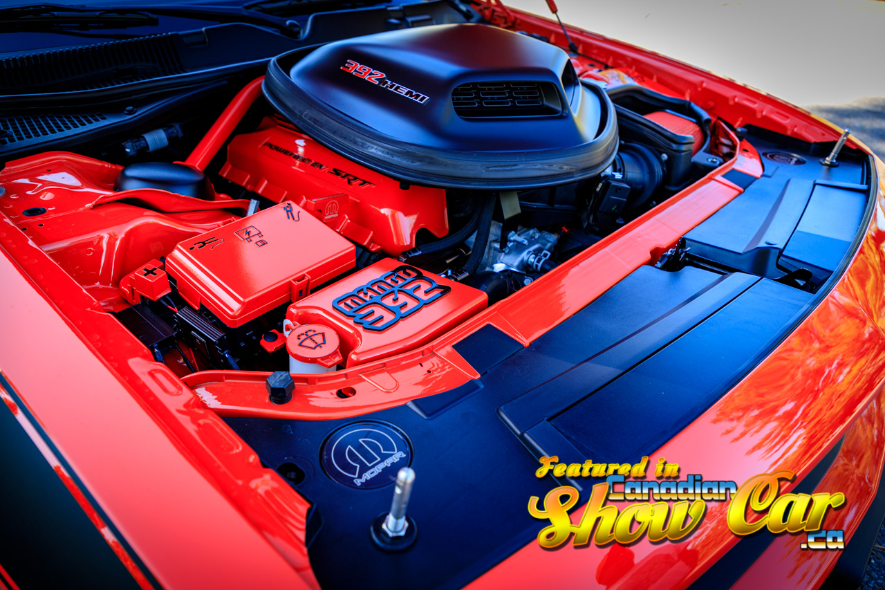 What he ended up with was not just a Hemi, but a 392 Hemi! And that's how his journey with his Go Mango Orange, 2017 Dodge Challenger R/T with a Scat Pack Shaker hood started back in the month of September 2017. Since it was already later in the season, he decided he had to put it away in storage for the Winter months. And that's when the parts started to be purchased and added to the car! Last Summer when it came out of storage he had added a Dyno Max exhaust system and many new engine dressing parts under the hood all custom painted in Go Mango Orange matching the cars paint scheme.